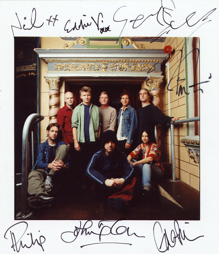 One of the best images I have in my brain right now is of Johnny Marr (ex The Smiths) playing the ukelele. Because my BT (Bloody Terrible) ADSL line decided to fail, I got to see this on a 56k connection - but it was still marvellous nonetheless. Good news is that Johnny will join Neil Finn for some of his imminent UK tour, too. Oh, and Eddie Vedder is lovely and ickle. So sez my friend Peter.... (who got to transform Eddie a la 70's glam!!) It was such an amazing line-up. [pics from Peter]